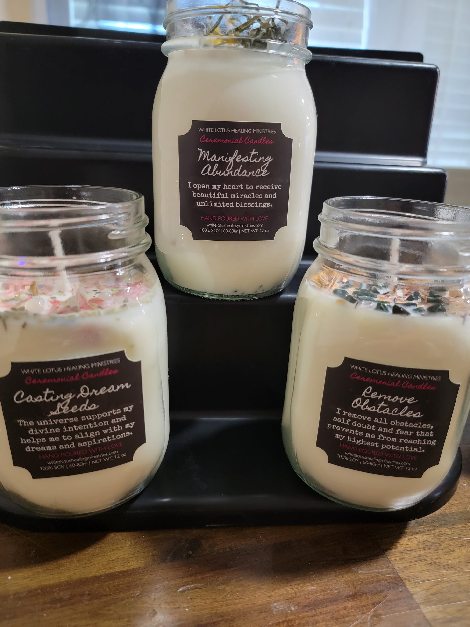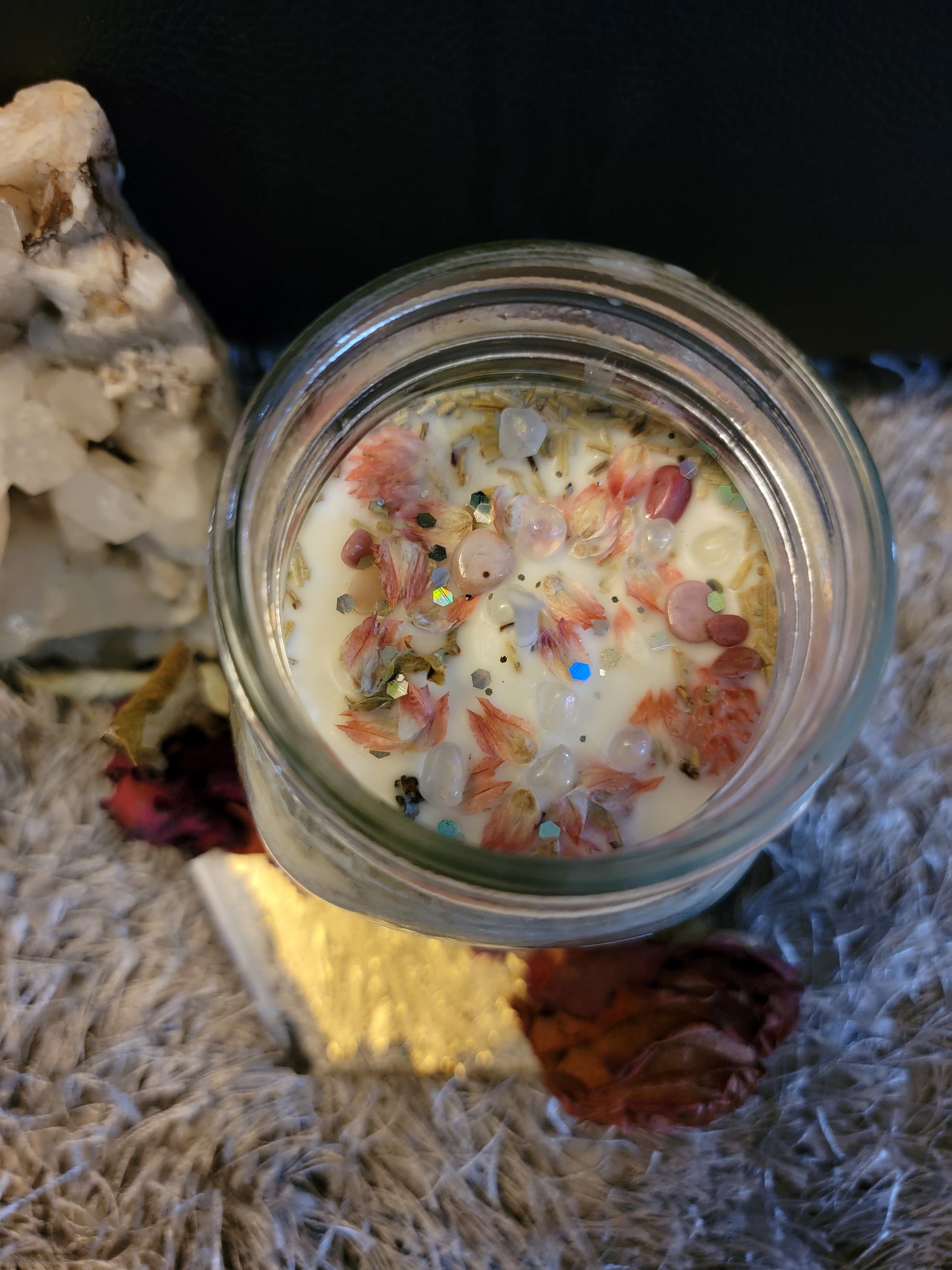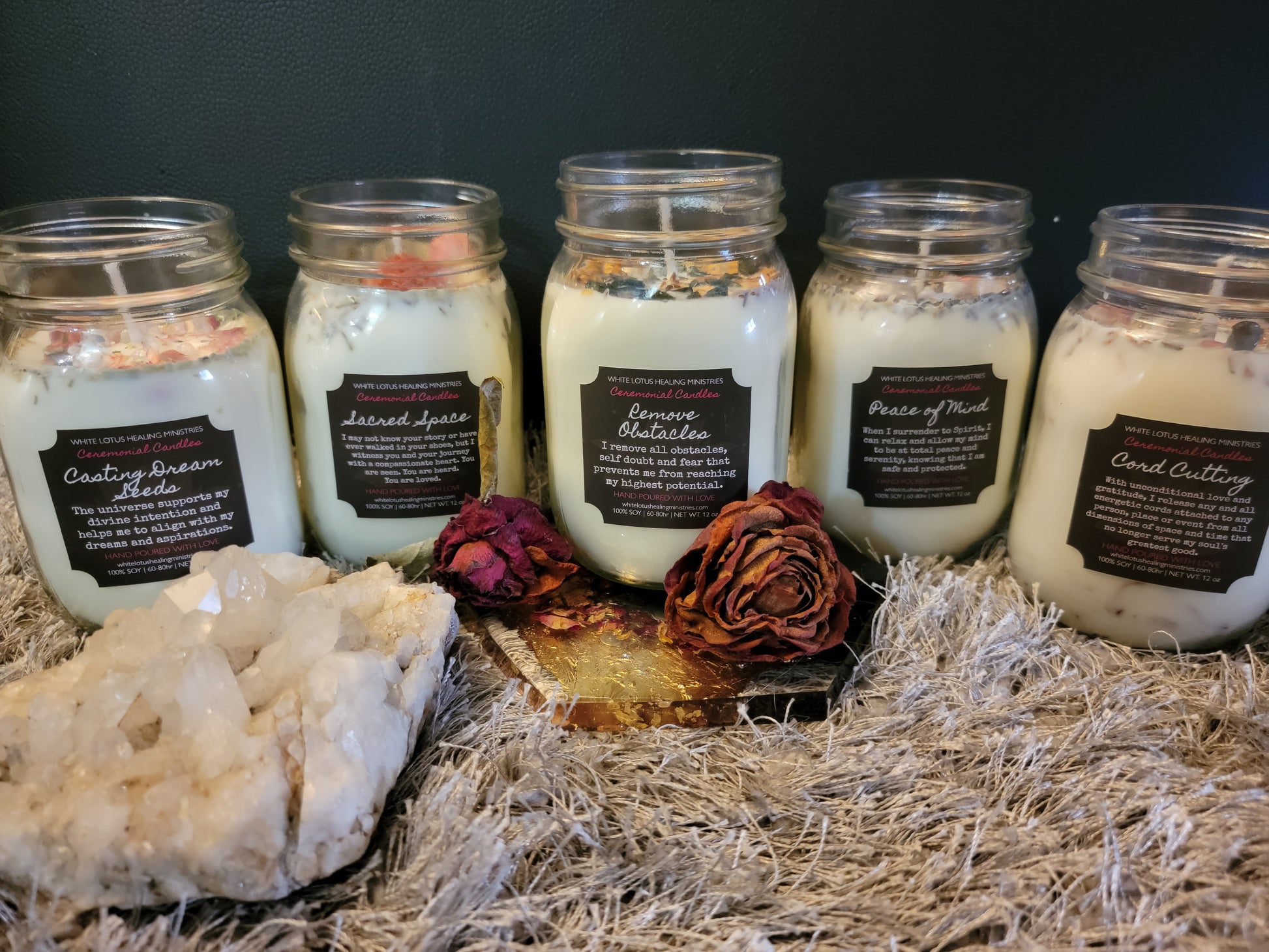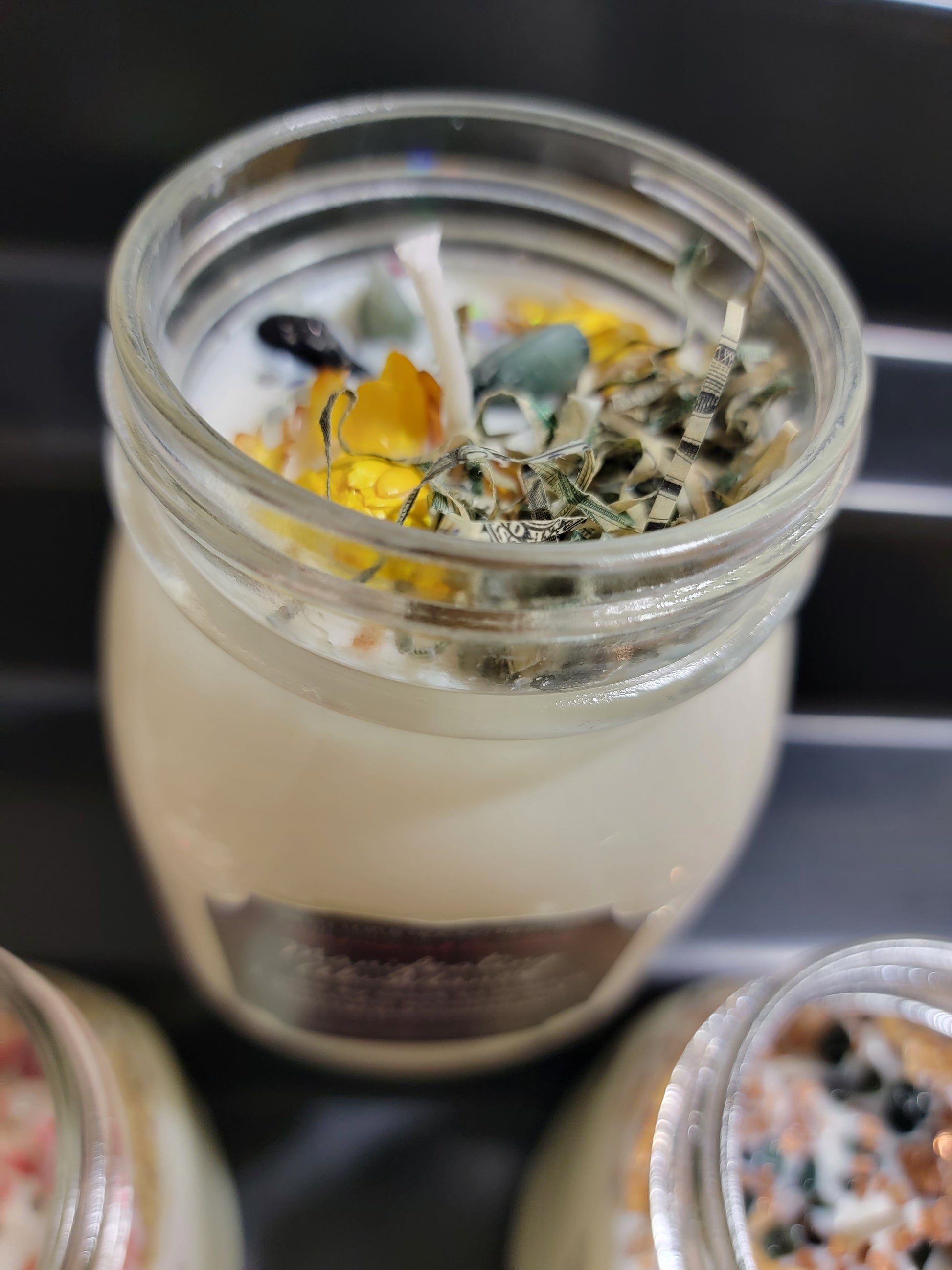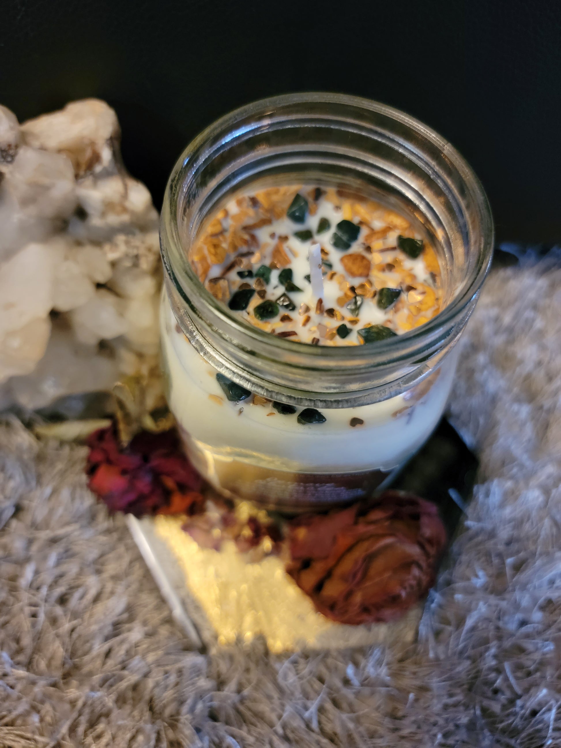Our Ceremonial candle collection amplifies your personal intentions. Each candle has been hand-crafted with select gemstones to match the essence of the energy. Candles may contain real gemstones, gold flake, herbs, and/or flowers. Lightly scented with our unique blend of essential oils.