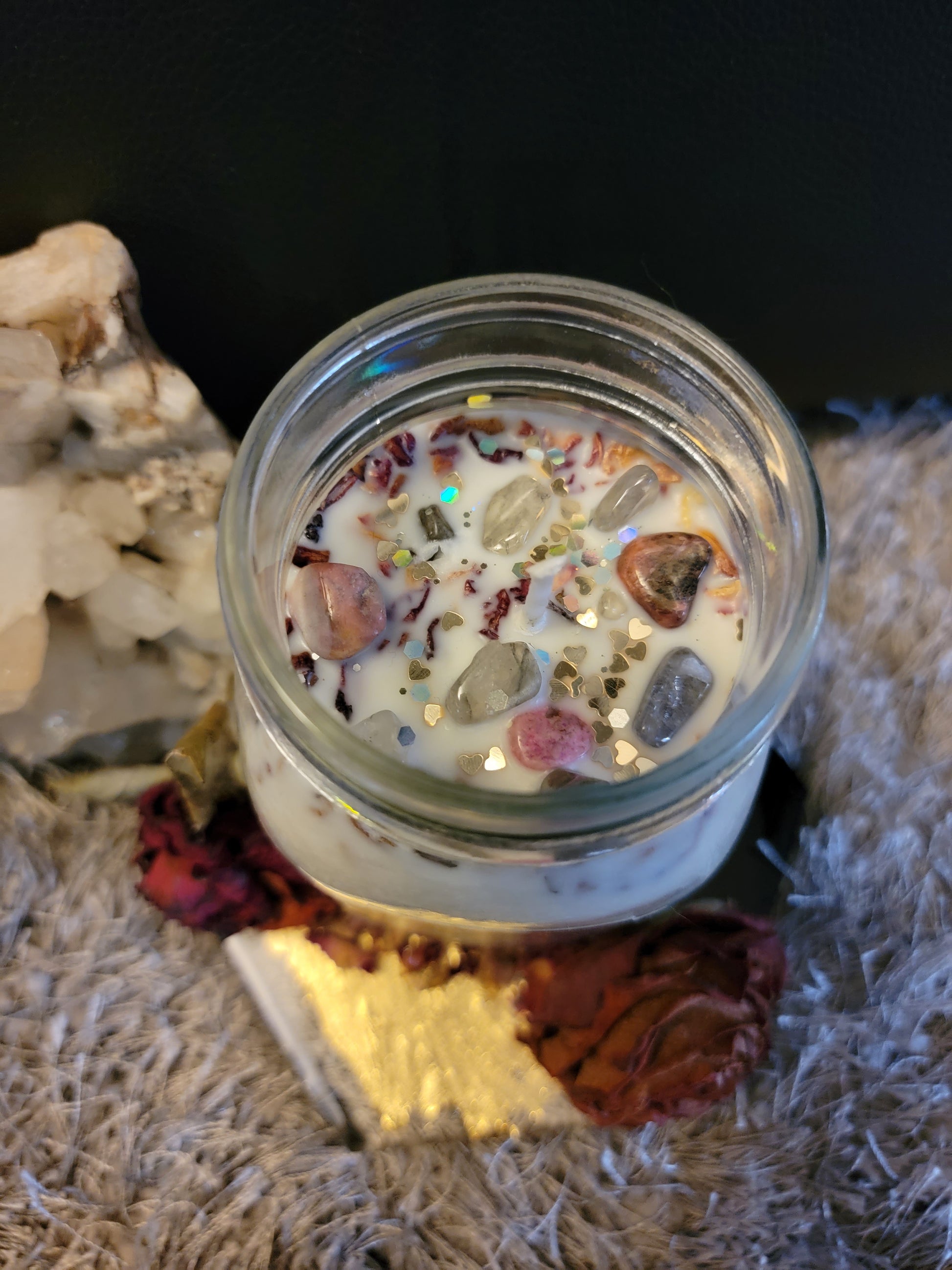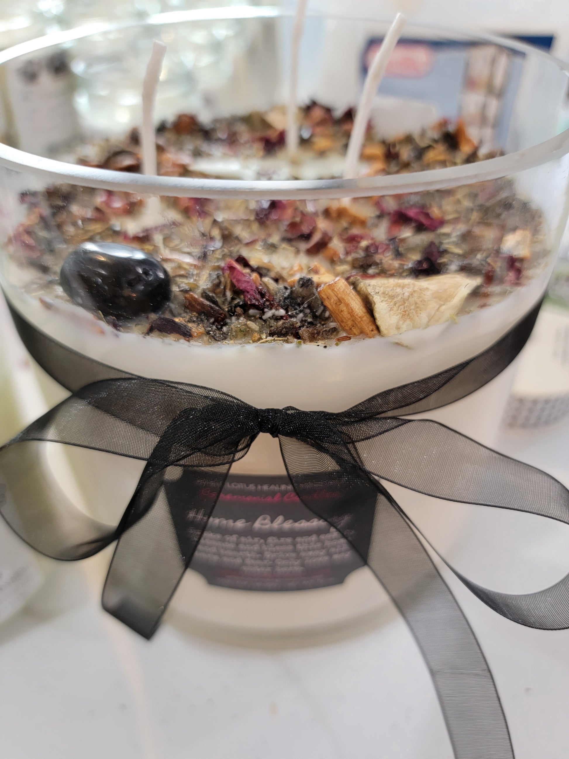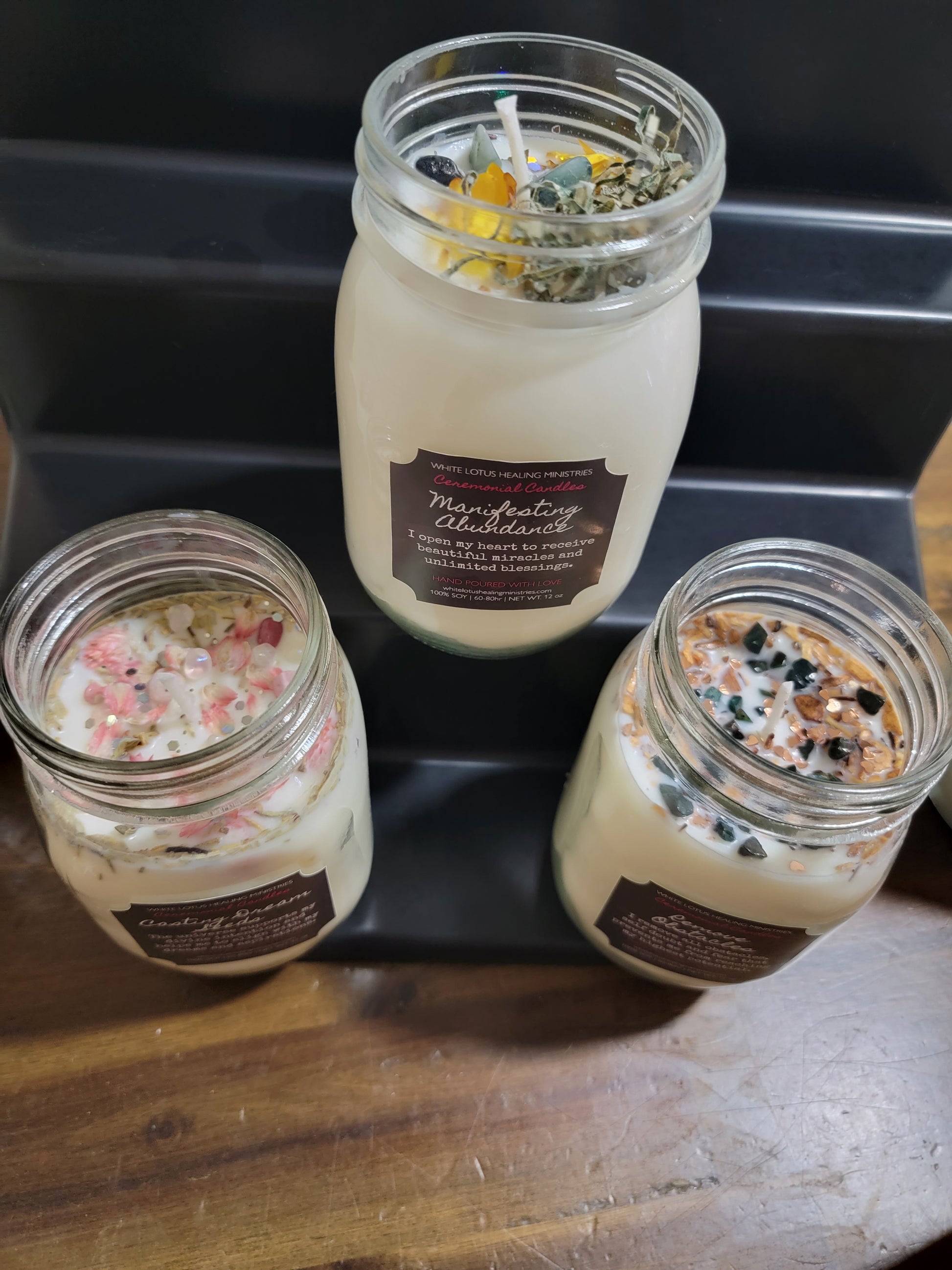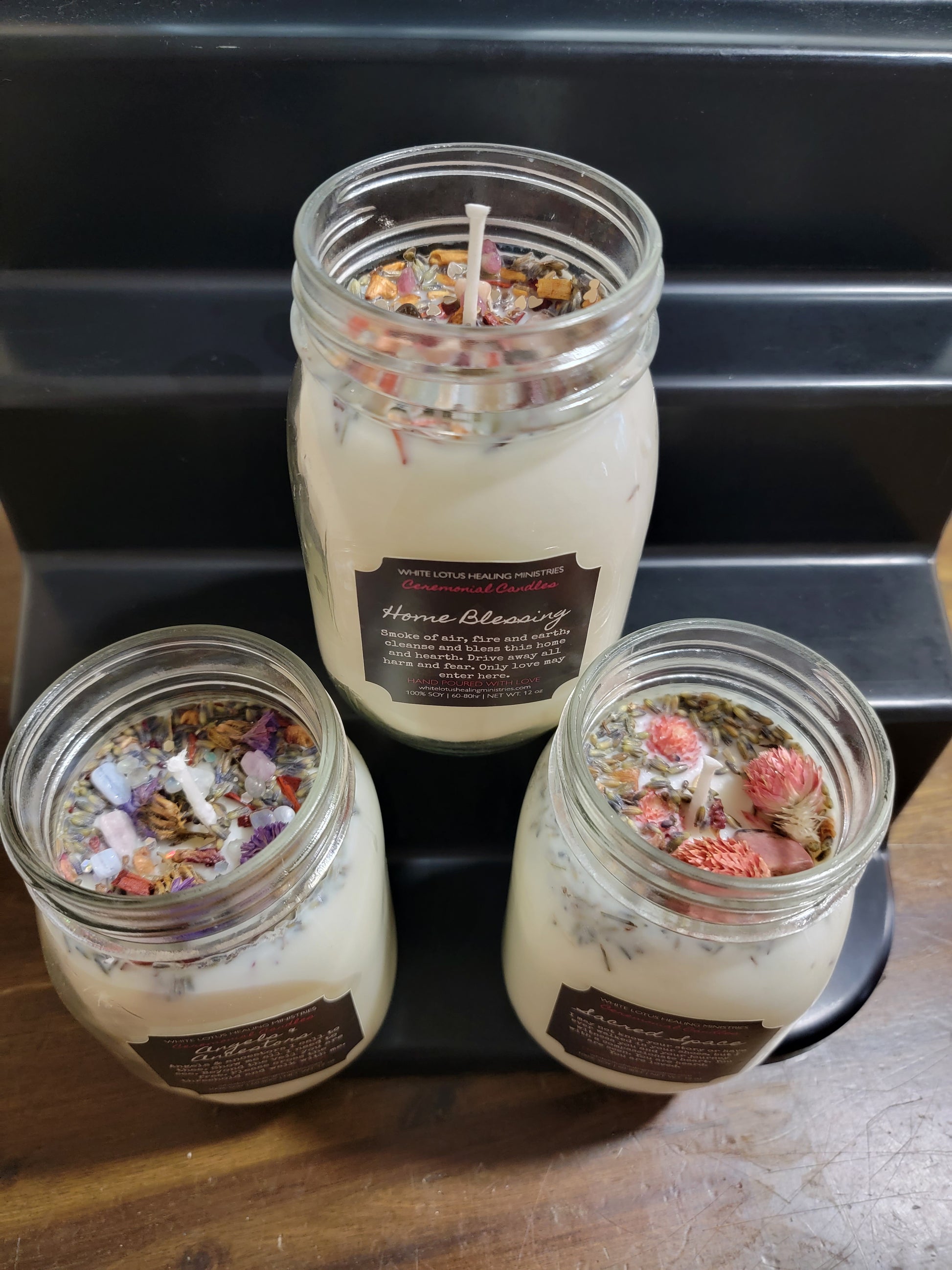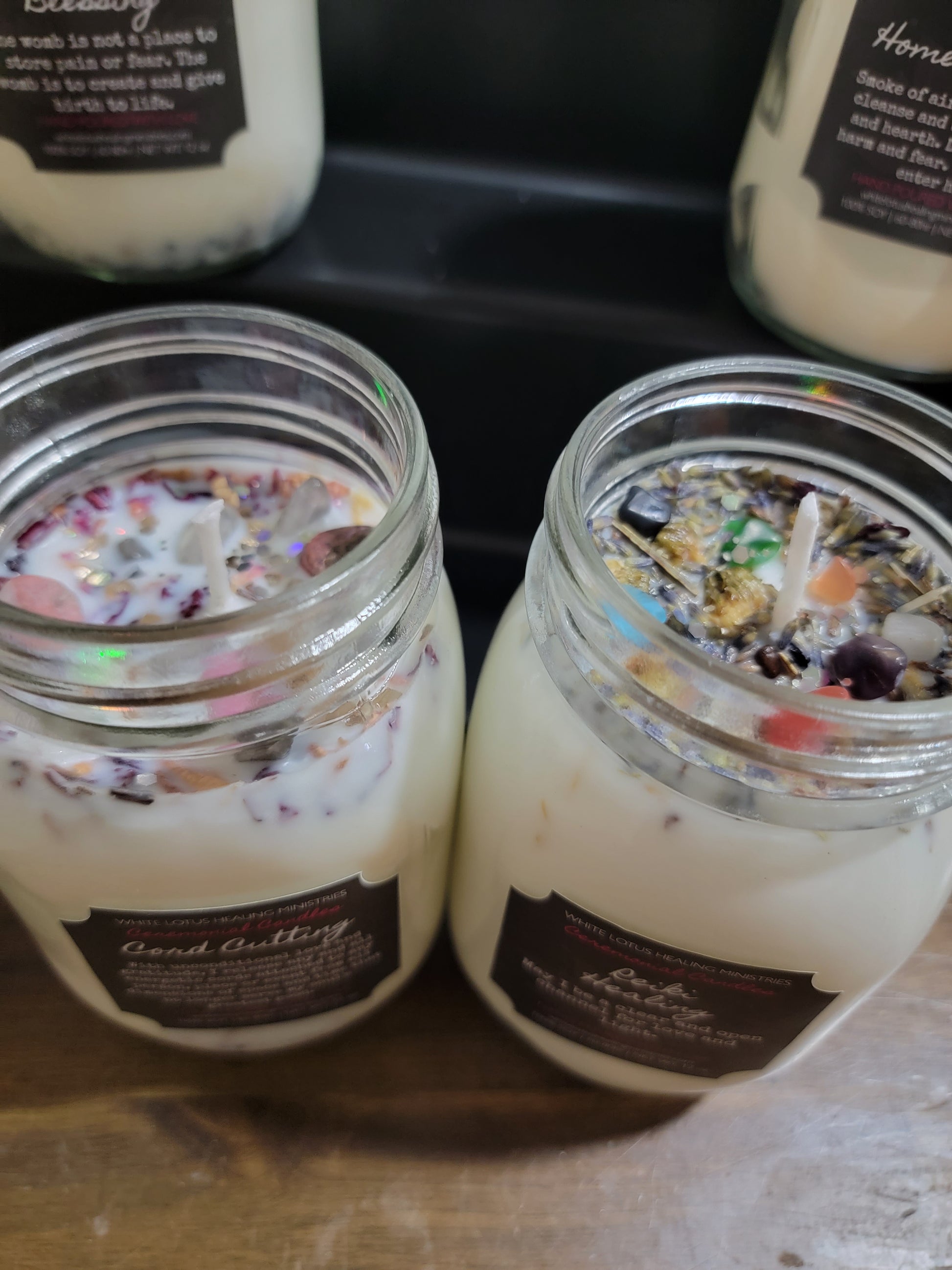 Our Ceremonial candle collection amplifies your personal intentions. Each candle has been hand-crafted with select gemstones to match the essence of the energy. Candles may contain real gemstones, gold flake, herbs, and/or flowers. Lightly scented with our unique blend of essential oils.