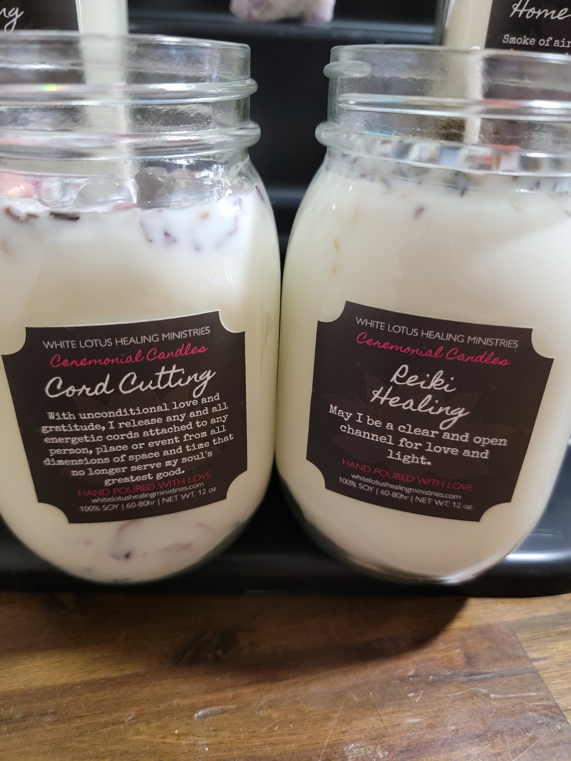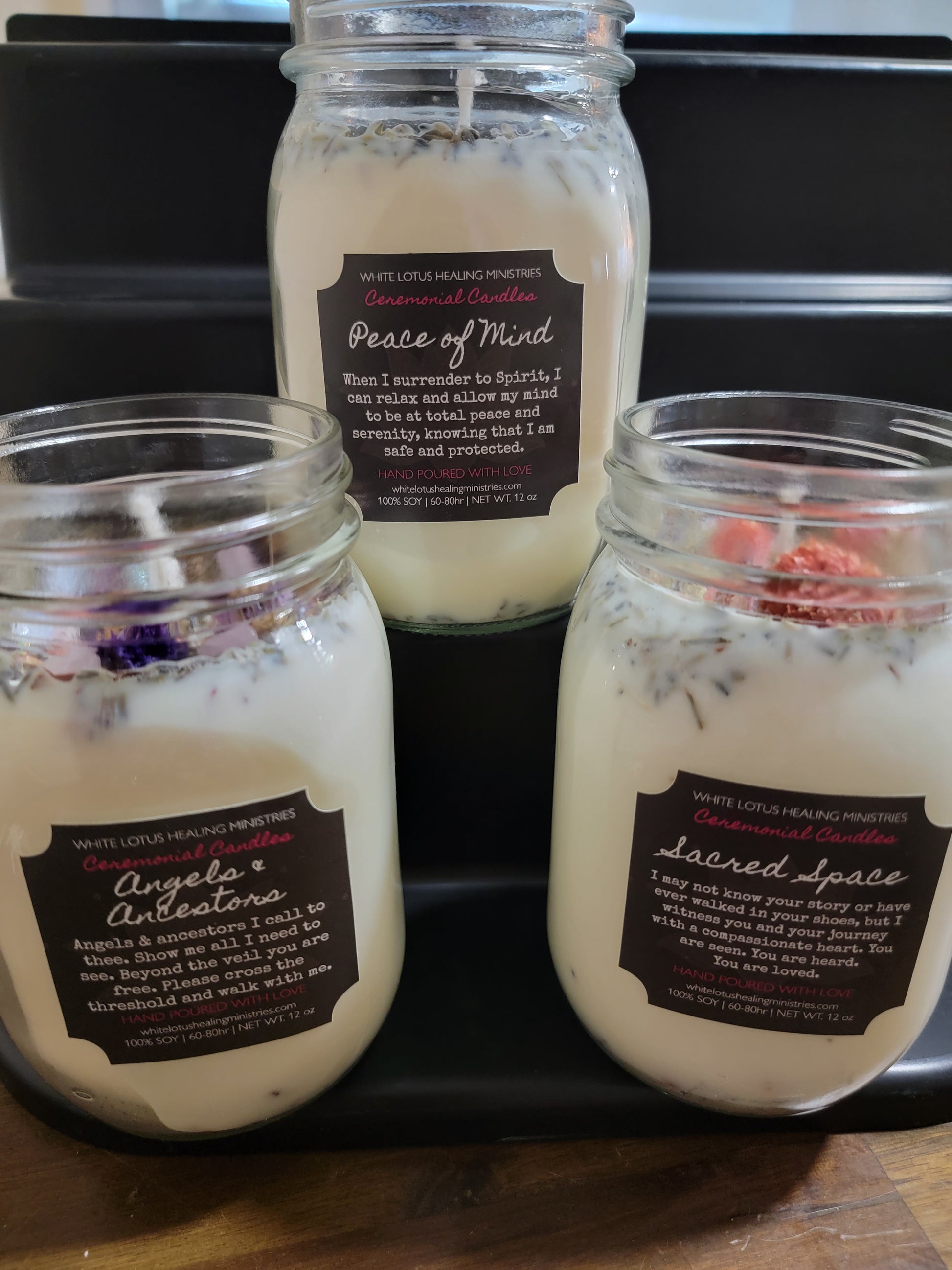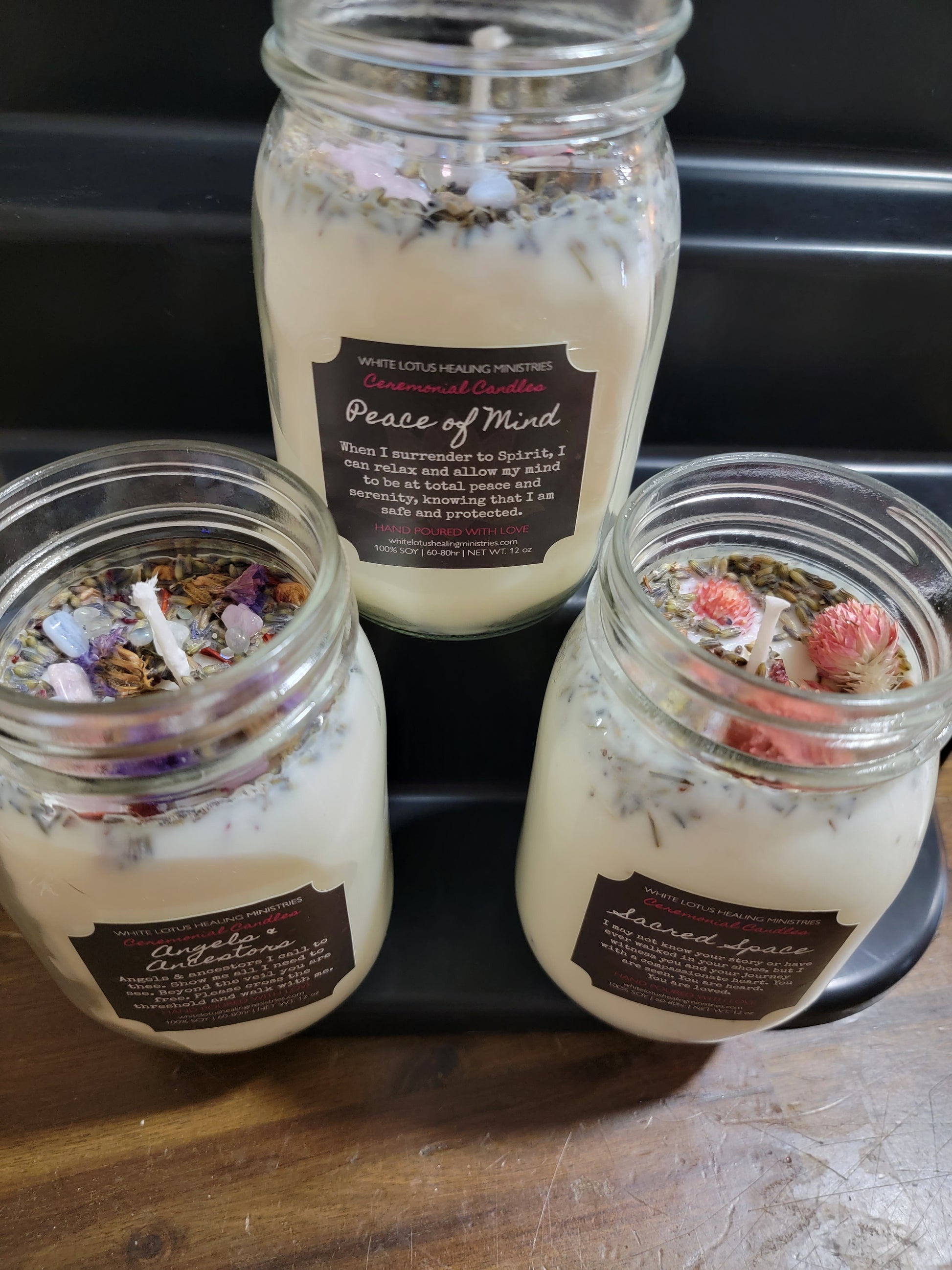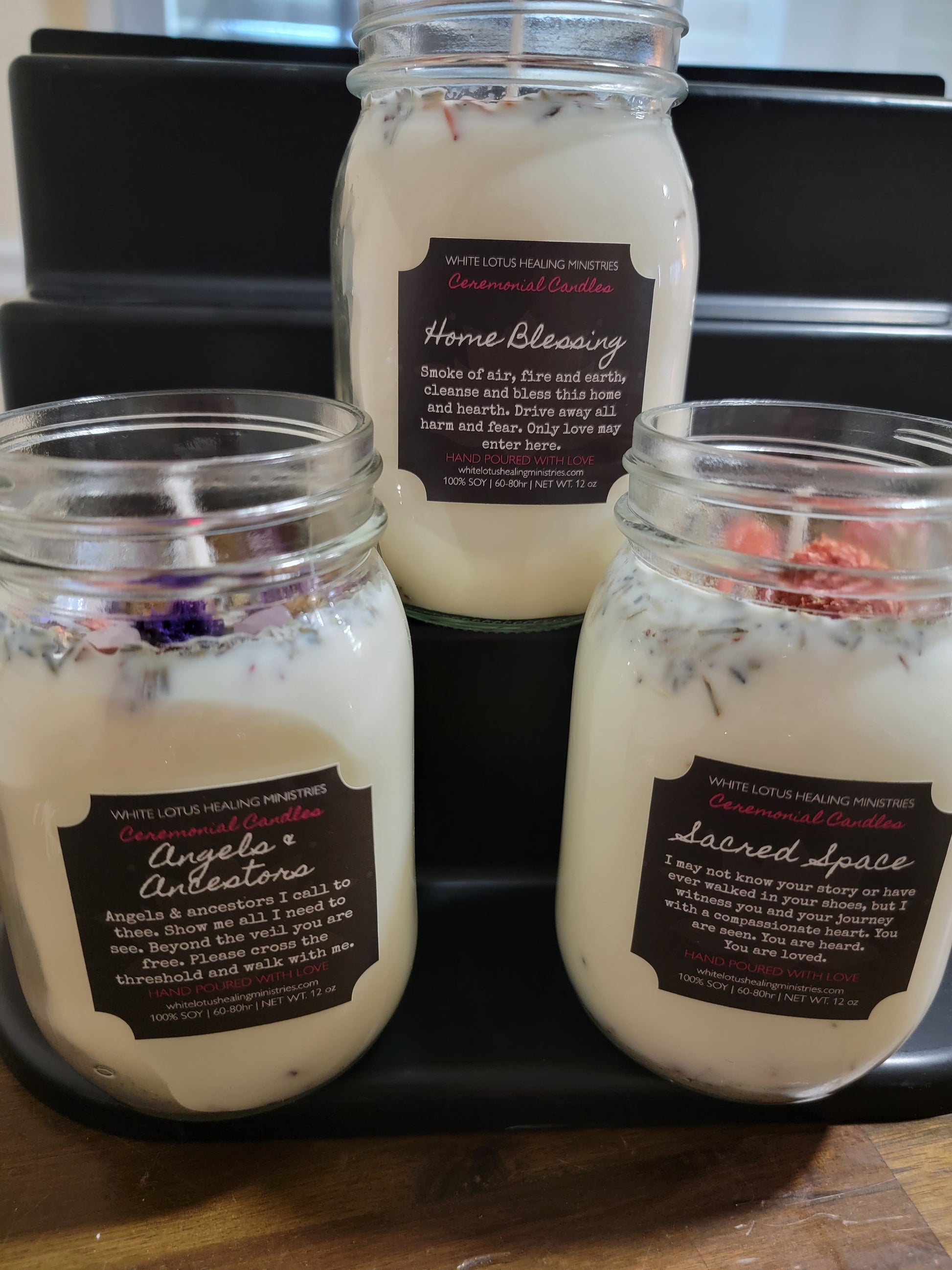 Our Ceremonial candle collection amplifies your personal intentions. Each candle has been hand-crafted with select gemstones to match the essence of the energy. Candles may contain real gemstones, gold flake, herbs, and/or flowers. Lightly scented with our unique blend of essential oils.