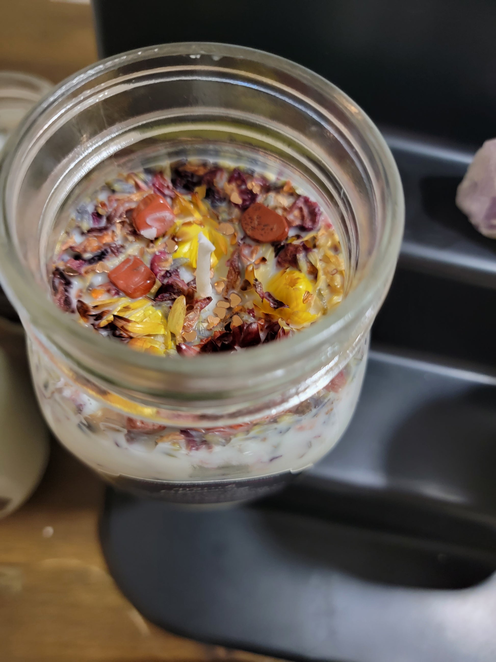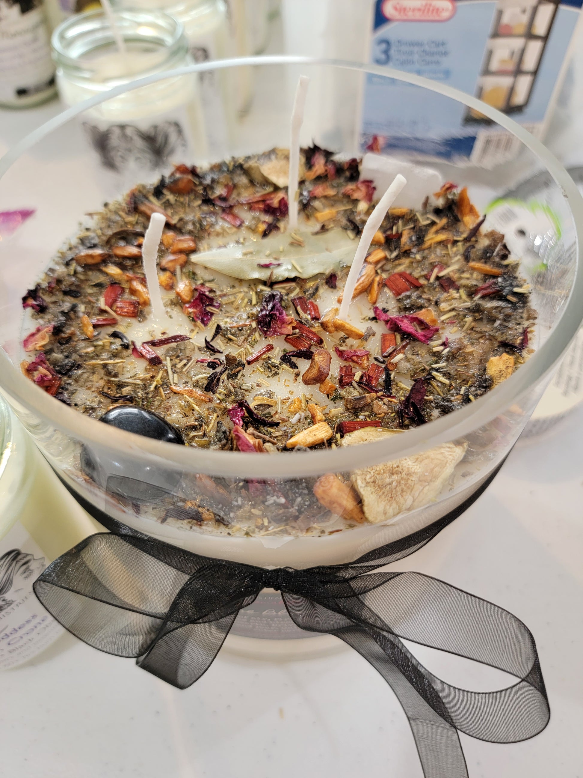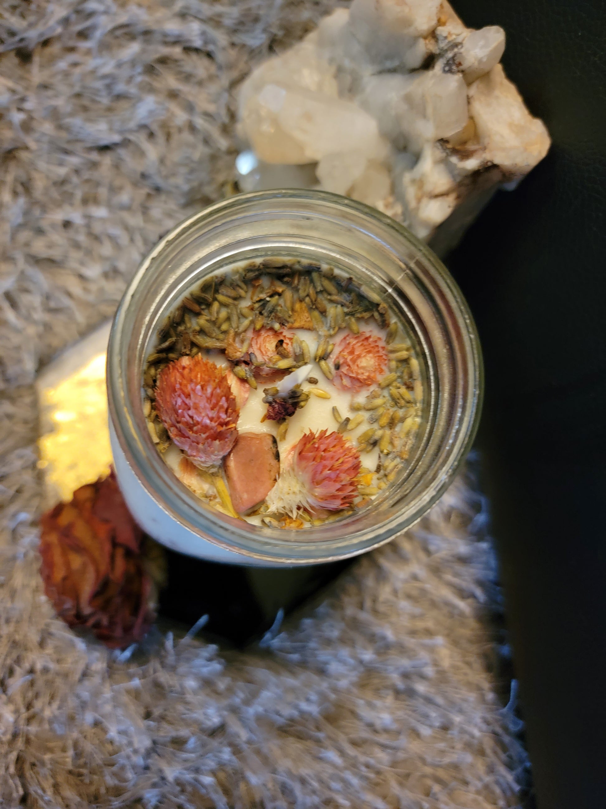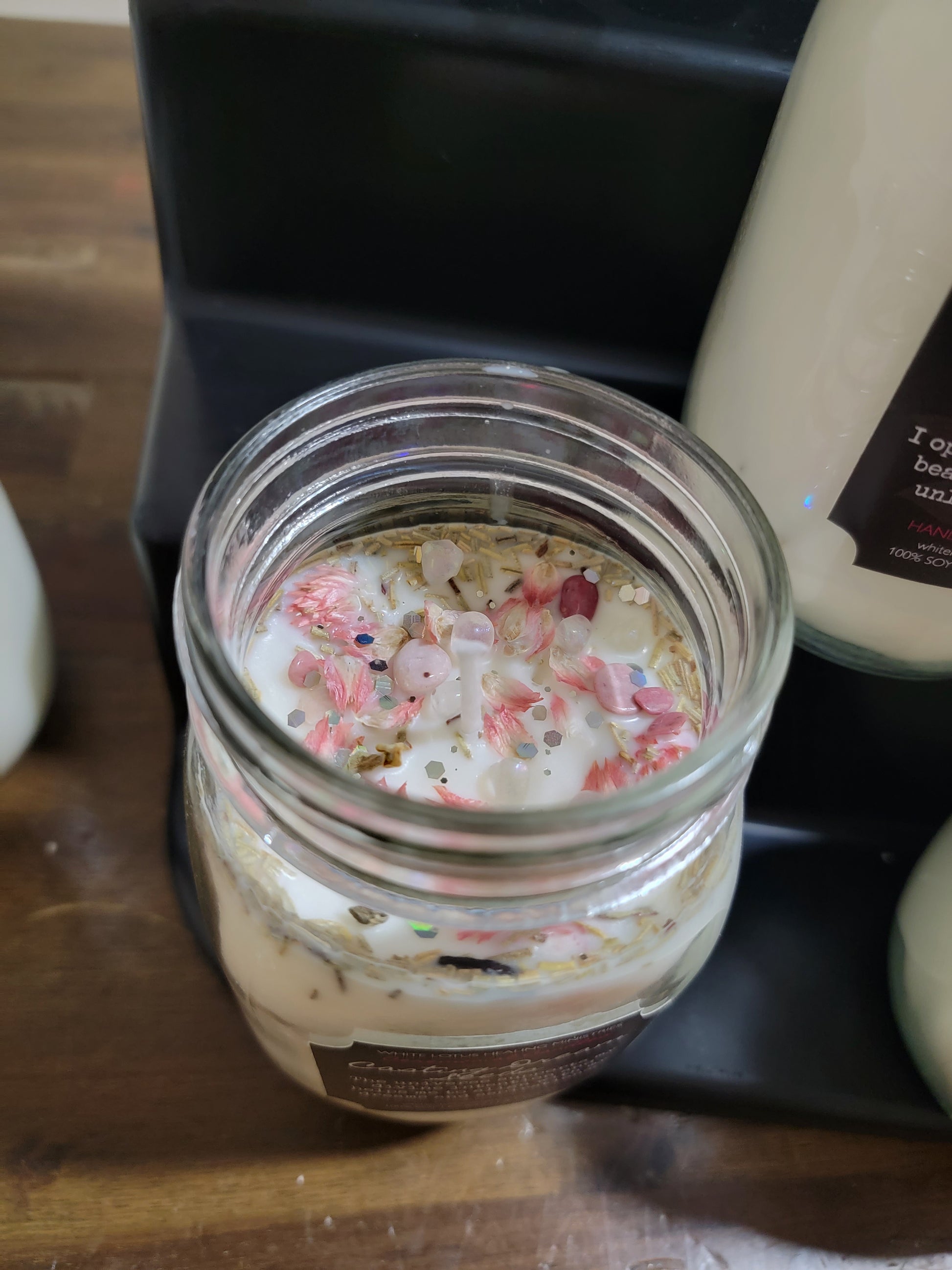 All candles made to order. Please note that the candles in the images contain more "toppings" than those that will ship for safety purposes. Please be sure to keep lit candles attended, and do not burn longer than 2-3hrs at a time. Trim wicks to about 1cm above wax before use.