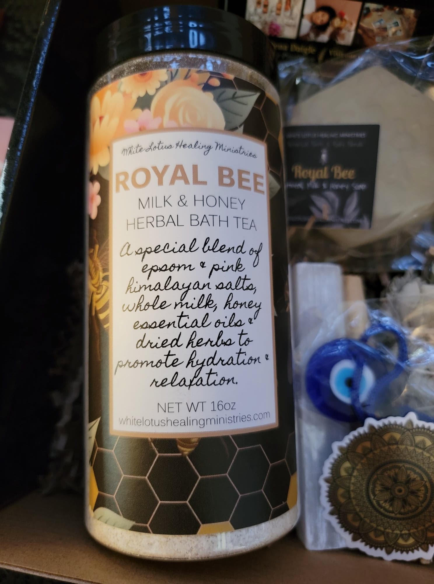 Box includes: (1) *16oz Royal Bee Milk & Honey Herbal Bath Tea; (1) *Royal Bee Soap; (1) *10ml Manifesting Abundance Essential Oil Roller; (1) *4oz MayDay Smudge Spray; (2) *green dressed ceremony candles; (1) White Sage Bundle; (1) Palo Santo Stick; (1) Save the Bees Grow Kit; (1) Selenite Wand; and 3 BONUS GIFTS!!
