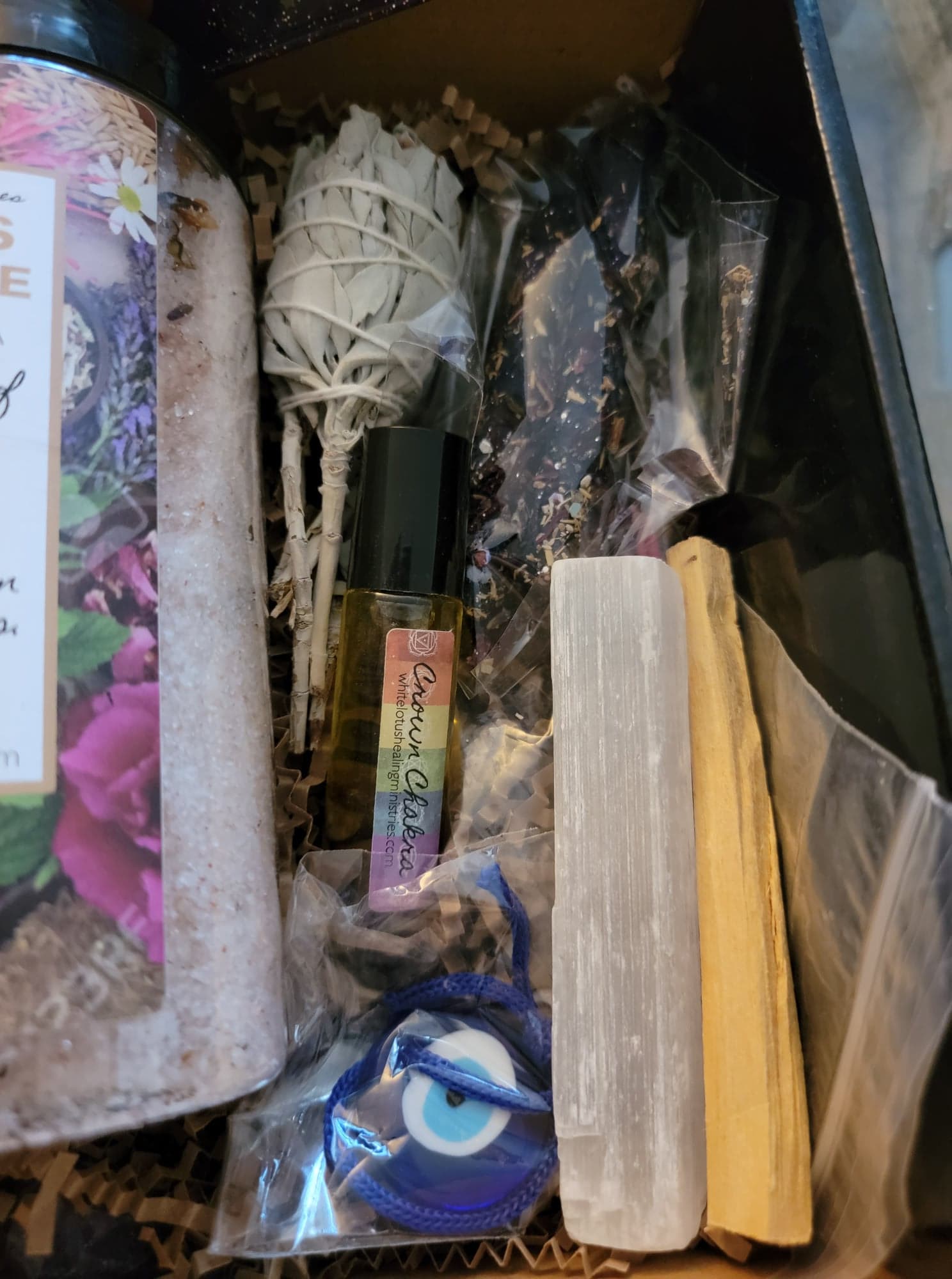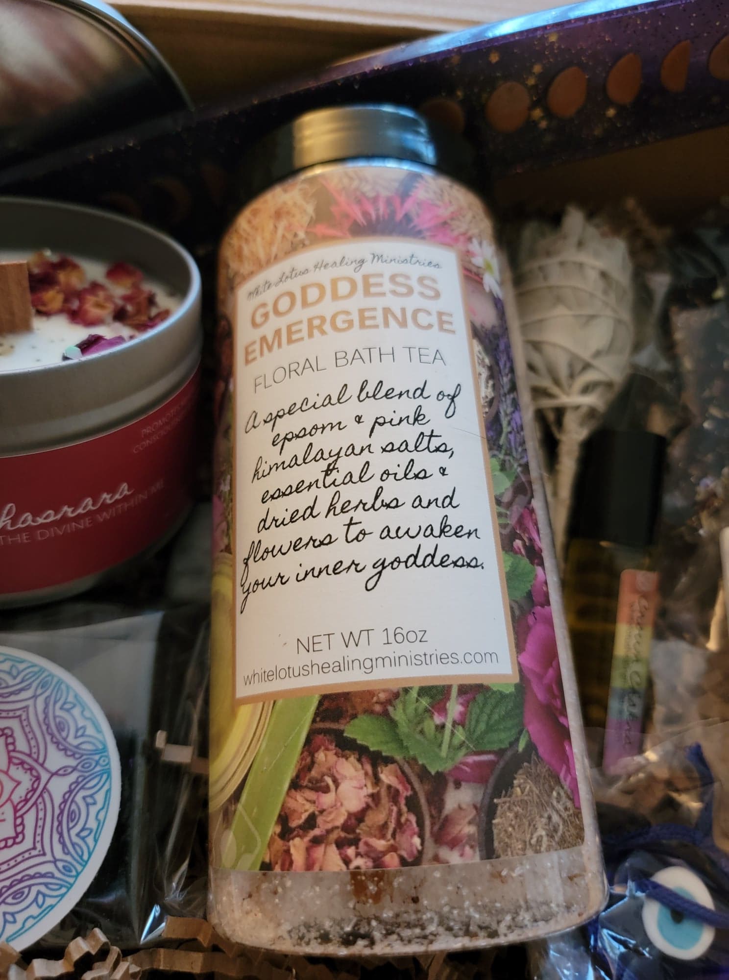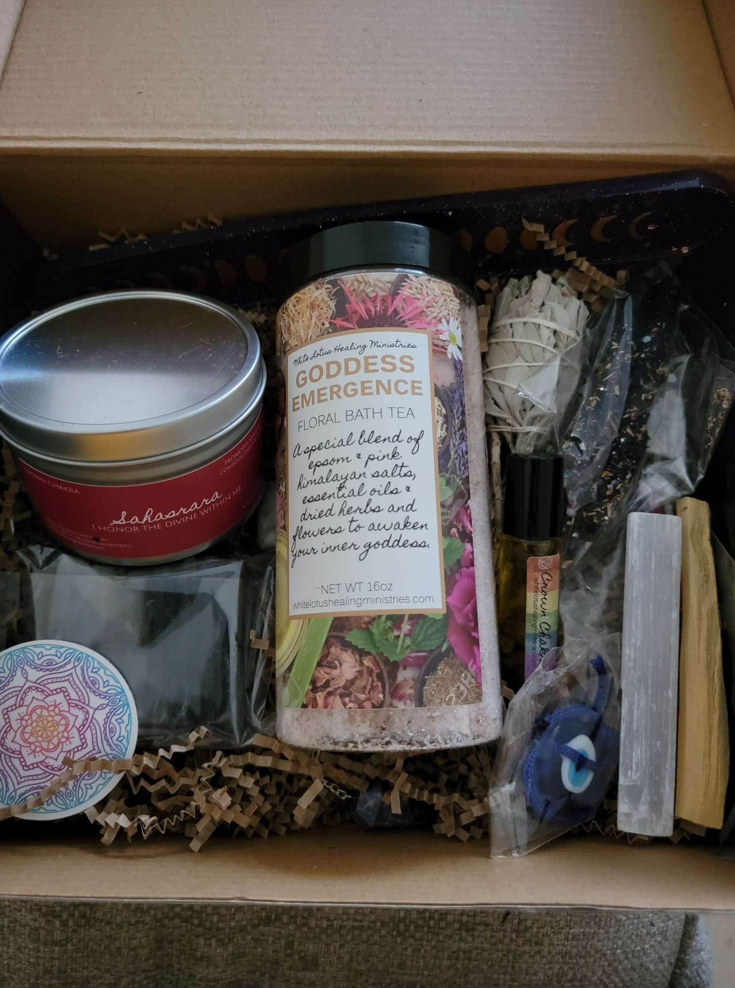 Box includes: (1) 16oz Goddess Emergence Floral Bath Tea; (1) 8oz Crown Chakra Candle; (1) 10ml Crown Chakra Essential Oil Roller; (1) Charcoal Soap; (2) black dressed ceremony candles; (1) White Sage Bundle; (1) Palo Santo Stick; (1) incense holder w/ (6) mini incense sticks; (1) Selenite Wand; (1) Evil Eye Pendant; and 3 BONUS GIFTS!!