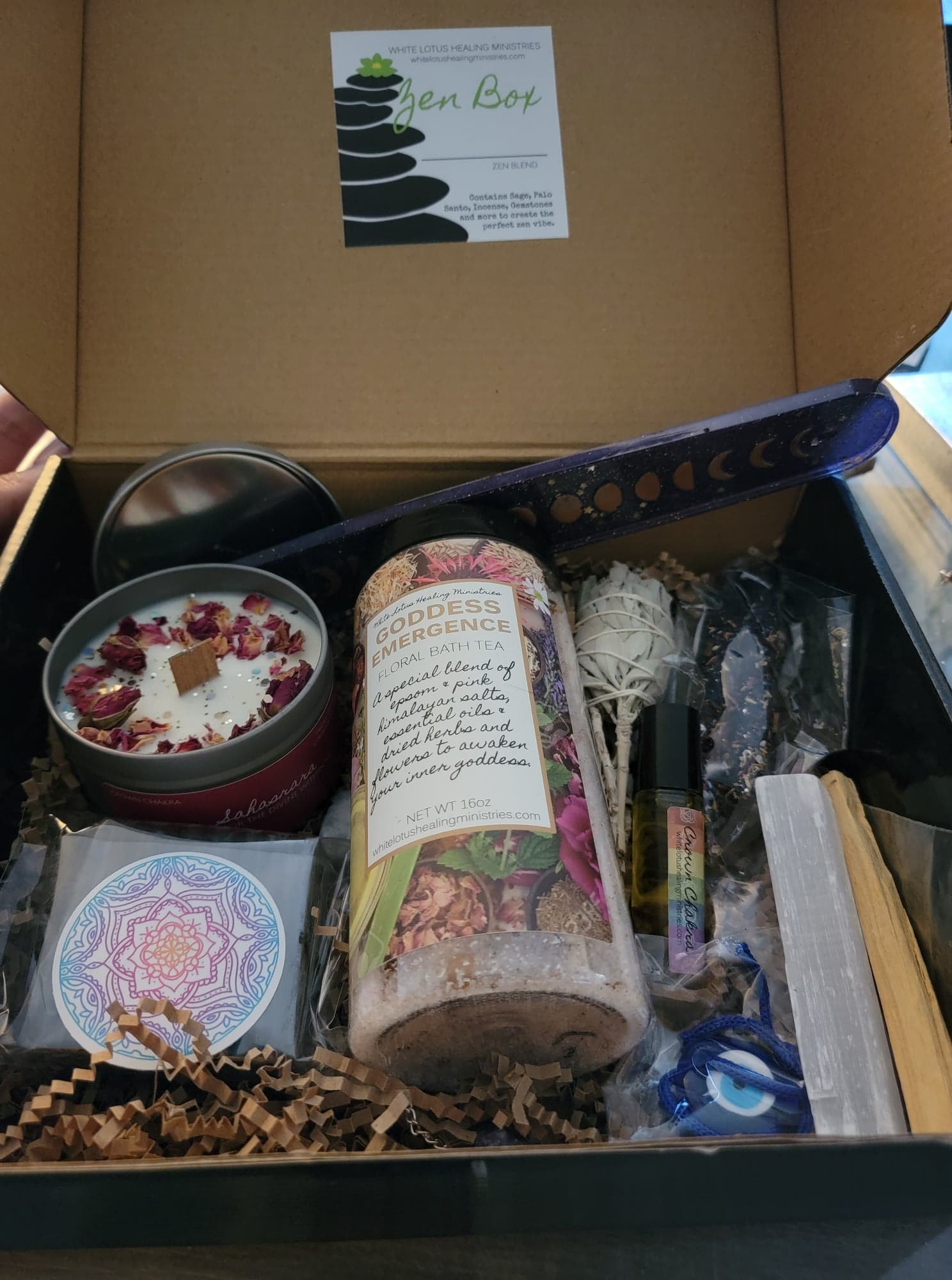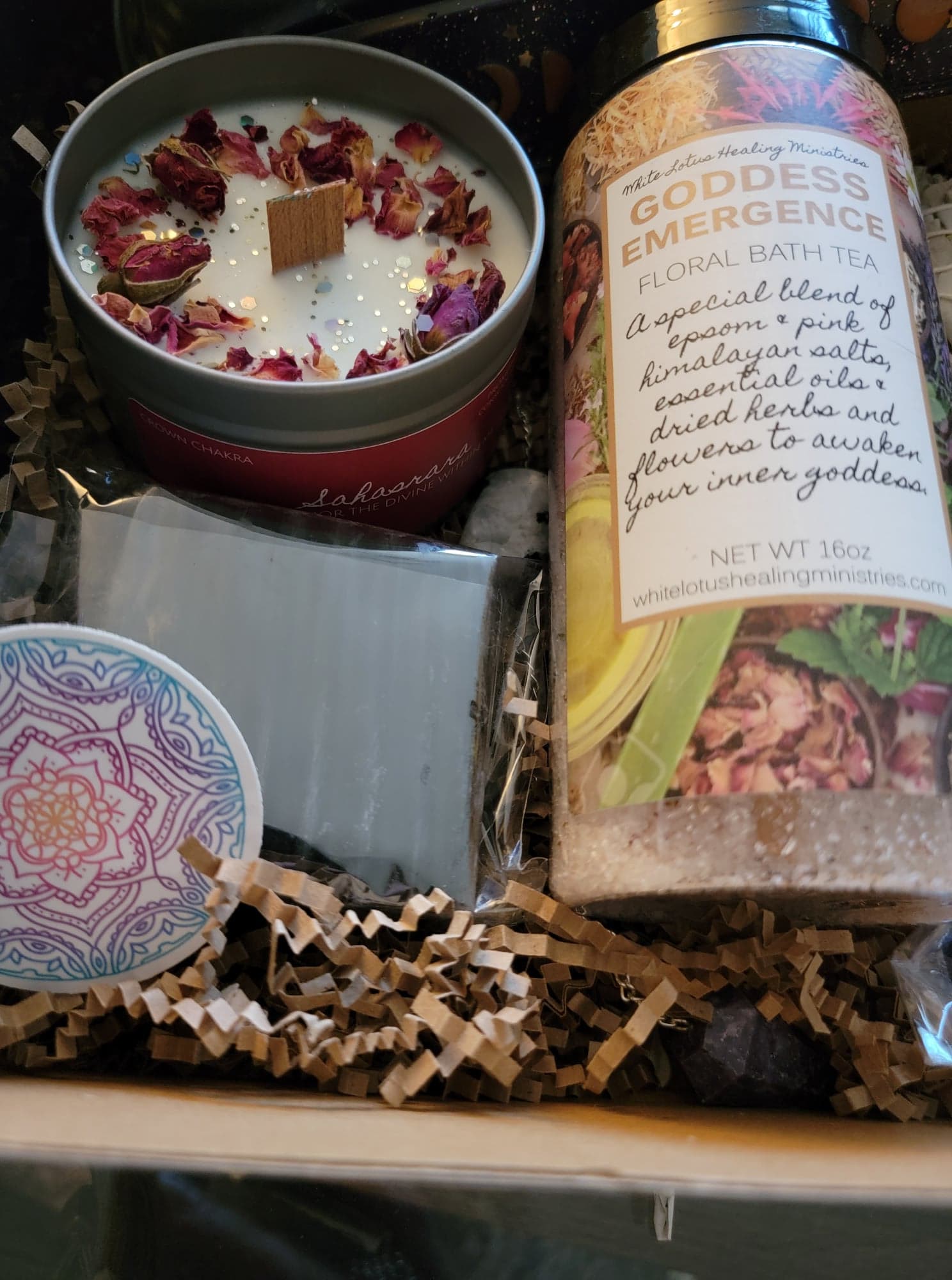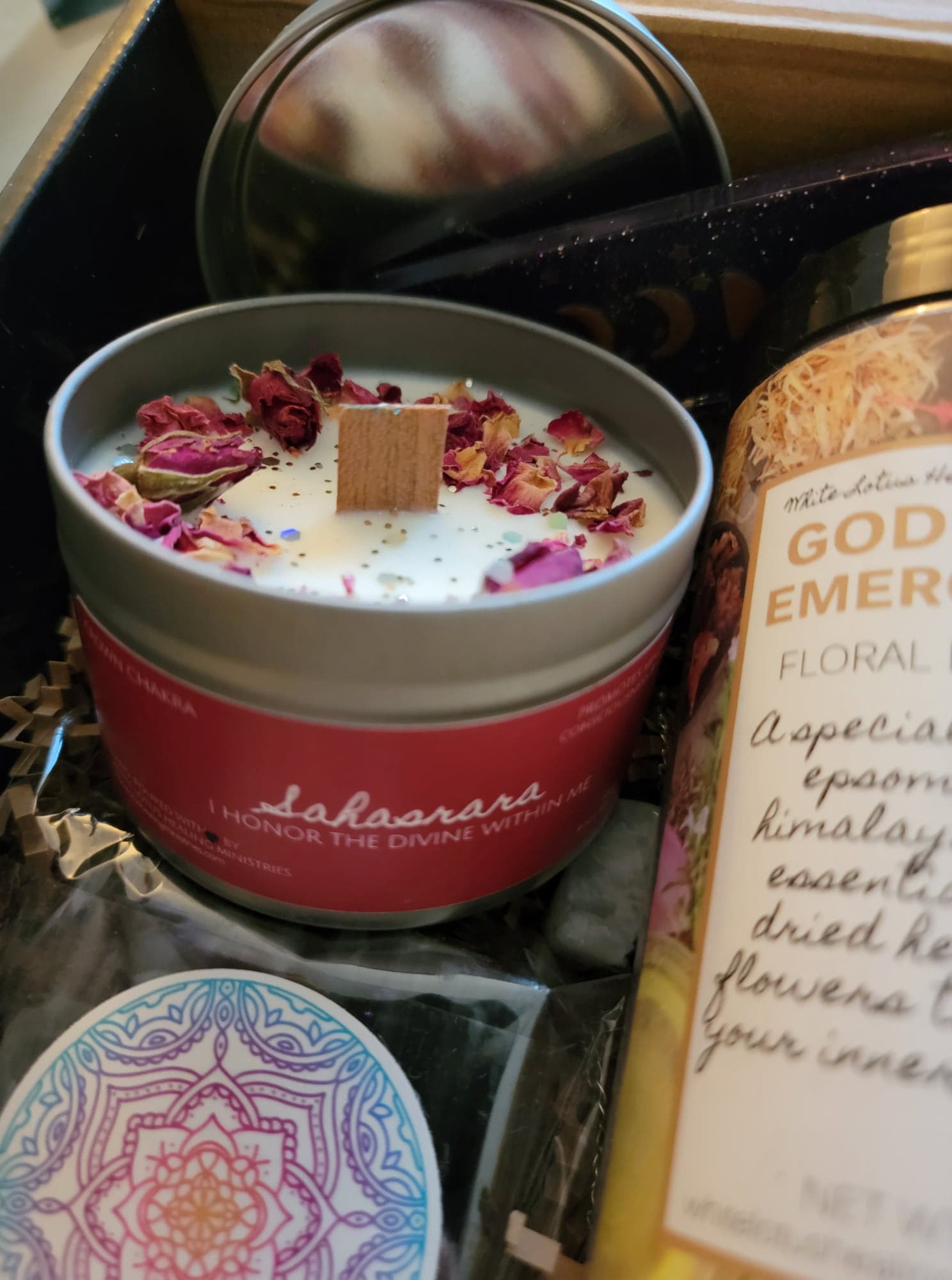 Box includes: (1) 16oz Goddess Emergence Floral Bath Tea; (1) 8oz Crown Chakra Candle; (1) 10ml Crown Chakra Essential Oil Roller; (1) Charcoal Soap; (2) black dressed ceremony candles; (1) White Sage Bundle; (1) Palo Santo Stick; (1) incense holder w/ (6) mini incense sticks; (1) Selenite Wand; (1) Evil Eye Pendant; and 3 BONUS GIFTS!!